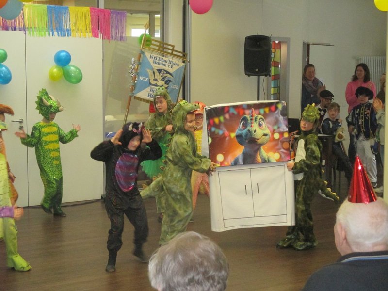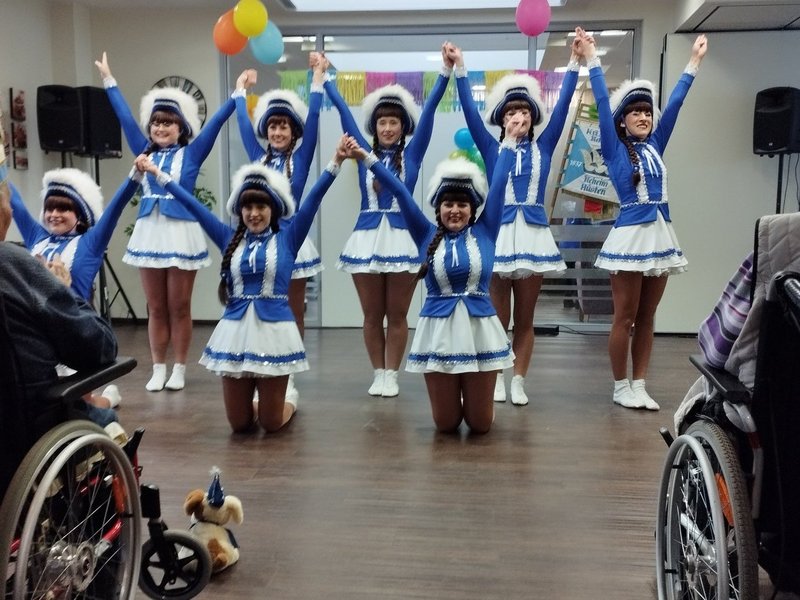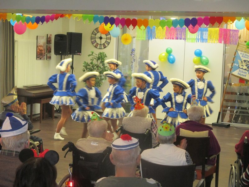 Am Karnevalssamstag schallte wieder der Ruf "Westfalen Helau und Möppel wau wau" durch unser Haus, denn die Karnevalsgesellschaft blau-weiß Neheim war zu Besuch! Mit Gardetänzen, Büttenreden, Showtanz und flotter Musik sorgten sie für jede Menge gute Stimmung und Begeisterung. Ganz feierlich überreichten die Prinzenpaare der ältesten Bewohnerin und dem ältesten Bewohner im Saal einen Sessionsorden. Allen Akteuren wurden von unserer Bastelgruppe selbst hergestellte "Mäuseorden" überreicht, die viel Anerkennung erhielten. Das schönste Versprechen kam von einem kleinen Mädchen am Ende der Veranstaltung, das aufgeregt und voller Freude verkündete: "Wenn wir nächstes Jahr wiederkommen, dann tanze ich auch mit!" - so endete der Tag bereits mit Vorfreude auf das nächste Wiedersehen. Wir danken allen Beteiligten, die all den Faschingsspaß in unser Haus gebracht haben!