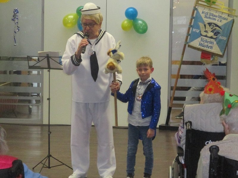 Doch damit war das bunte Faschingstreiben noch längst nicht vorbei: Die „lustigen Mäuse“ der sozialen Betreuung luden alle Bewohnenden zur Rosenmontagsfeier in die Aula ein. Frau Linnartz sorgte mit ihrer Gitarre und viel guter Laune für die musikalische Untermalung des Nachmittags und brachte alle zum Singen, Schunkeln und Klatschen. Das Haus durfte an diesem Tag große Persönlichkeiten (bzw. deren Doppelgänger) begrüßen: So waren z. B. Roy Black und Anita („Schön ist es auf der Welt zu sein“), Johannes Heesters („Ich werde 100 Jahre alt“) sowie Dick und Doof („Regentropfen, die an dein Fenster klopfen“) zu Gast. Ein Rollatortanz zum Lied „Ene Besuch im Zoo“ rundete die fröhliche Feier ab.