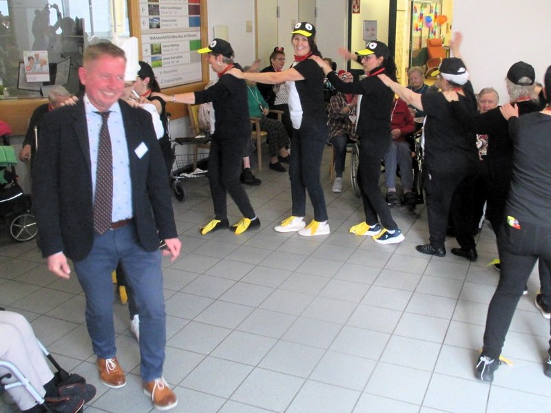 An Weiberfastnacht ging es rund: Die Kita-Kinder besuchten uns in ihren fantasievollen Konstümen und forderten unsere Bewohnenden und Mitarbeitenden zu lustigen Mitmachtänzen auf. Mit einer kunterbunten Faschingspolonaise brachten Groß und Klein die gute Stimmung und Freude in jeden Winkel unseres Hauses. Ganz traditionell waren auch unsere Damen der Hauswirtschaft mit einem kleinen Umzug unterwegs. Als Pinguine verkleidet verteilten sie selbstgebastelte Orden und süße Leckereien und ernteten jede Menge strahlende Gesichter. Pünktlich um 11:11 Uhr lockten die Pinguin-Ladies unseren Pflegedienstleiter Herrn Gremmer ins Forum. Dort wartete bereits eine unserer Bewohnerinnen mit einer Schere, um ihm feierlich und unter großem Jubel die Krawatte abzuschneiden.