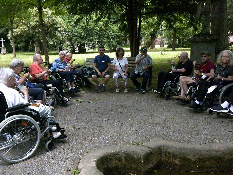 Am Donnerstag ging es auf einen kleinen Ausflug zum Alten Friedhof. Dort finden längst keine Begräbnisse mehr statt. Er wird gerne als Park und schattige Ruhe-Oase genutzt. Bei Eiskaffee und kleinen Leckereien genossen die Bewohner/-innen diesen entspannten Ausflug mit Picknick. In dieser schönen Atmosphäre hatten alle echte Urlaubsgefühle.