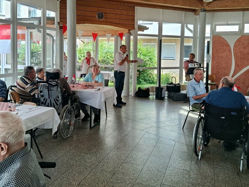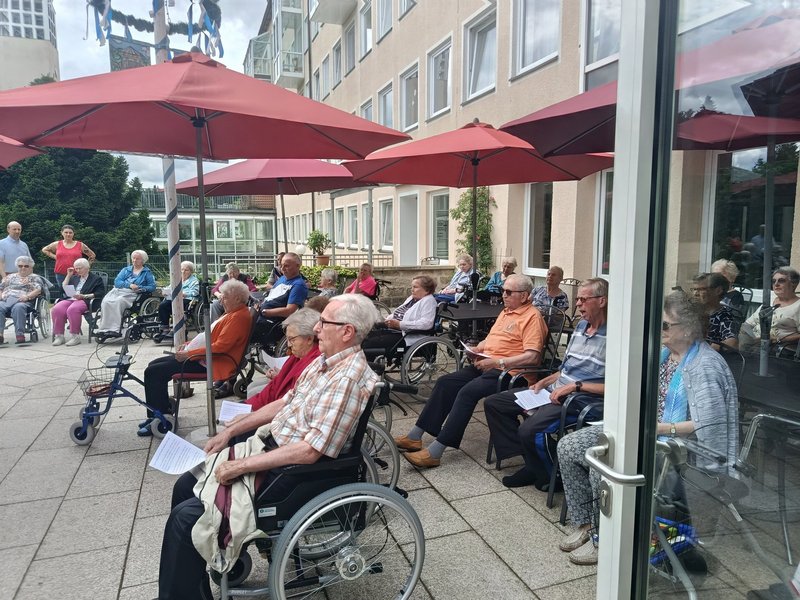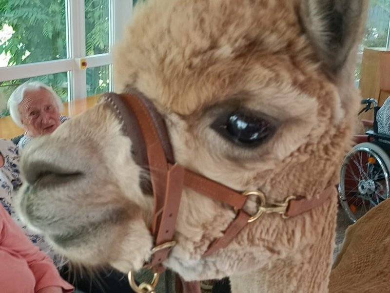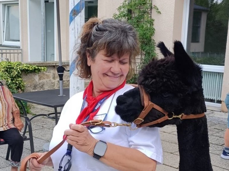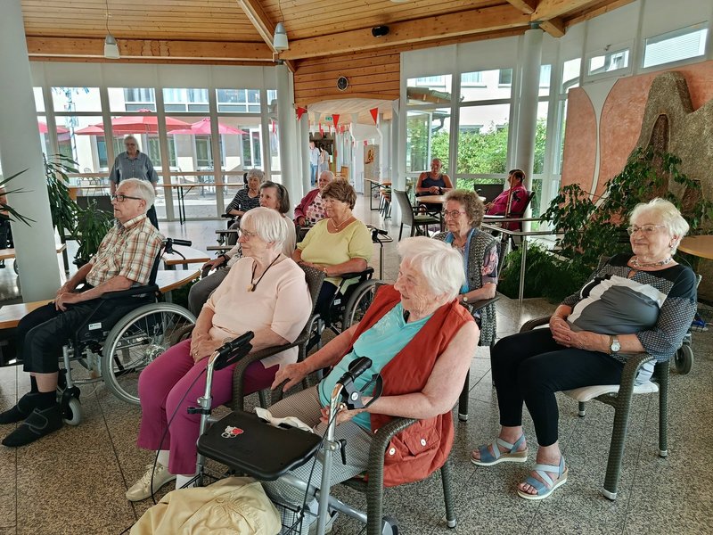 Die Urlaubswoche startete mit zünftiger Musik und Weißwurst. Der Musiker holte sich auch die Unterstützung der Bewohnerinnen und Bewohner. Am Nachmittag kamen die Alpakas zu Besuch. Für ein paar Leckerlis ließen sie sich gern streicheln.