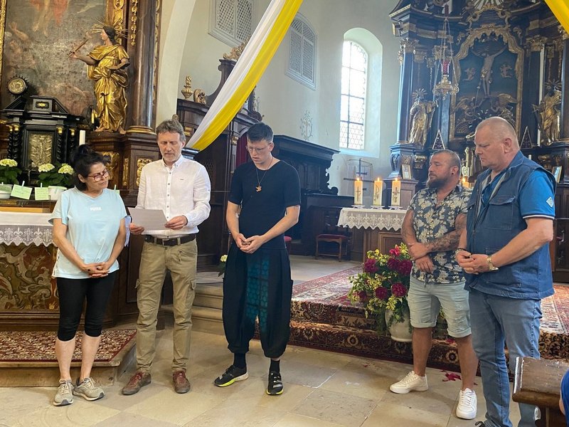 Unterwegs gedachten wir an Altbürgermeister Ewald Münch, einen alten und langjährigen Freund der Laufer Mühle und Gründer des Fördervereins Freundeskreis der Laufer Mühle e.V. Er war letztes Jahr mit 93 Jahren noch bei der Wallfahrt zu Fuß dabei. Ein Gebet für ihn in der Kapelle in Haid schloss ihn in unsere Weggemeinschaft mit ein.