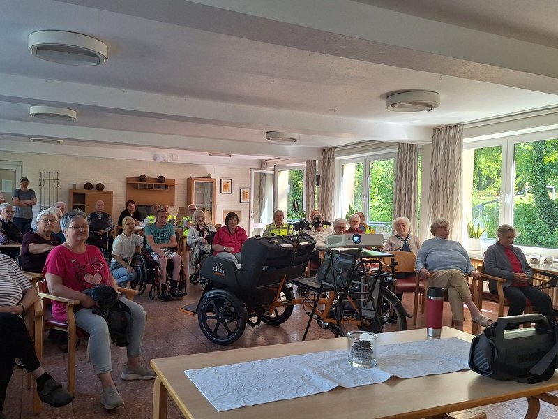 Im St. Josefshaus fand die erste Infoveranstaltung zum Projekt „Radeln ohne Alter“ statt. Ziel des Projekts ist es älteren Menschen kostenlose Rikscha-Fahrten zu ermöglichen und Soziale Teilhabe zu fördern. Viele Bewohnerinnen und Bewohner und deren Angehörige nahmen neugierig an den Schnupperfahrten teil. Heino Knuf, Leiter des Projekts in Rheine, stellte das Konzept vor und zeigte einen kurzen Film über die internationale Aktion. Einige Bewohnerinnen, die im Fernsehsaal in der ersten Reihe saßen, waren sehr neugierig und gespannt auf die Probefahrten und fragten: „Sind wir dann auch die Ersten, die gefahren werden?“ Andere waren etwas zögerlicher, aber letzten Endes zu neugierig, um nicht in die Rikscha zu steigen und sich fahren zu lassen.