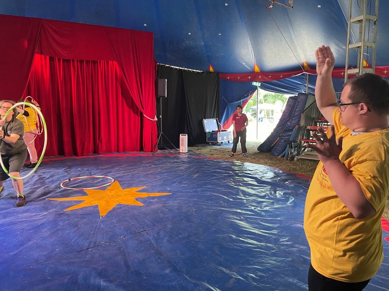 Doch auch im Zelt wurde fleißig weitergearbeitet: Die Artistinnen und Artisten probten ihre Zirkusnummern und klärten letzte Details für die große Show. Parallel stellte das Orga-Team mit tatkräftiger Unterstützung erste Verkaufsstände für den morgigen Zirkustag auf.